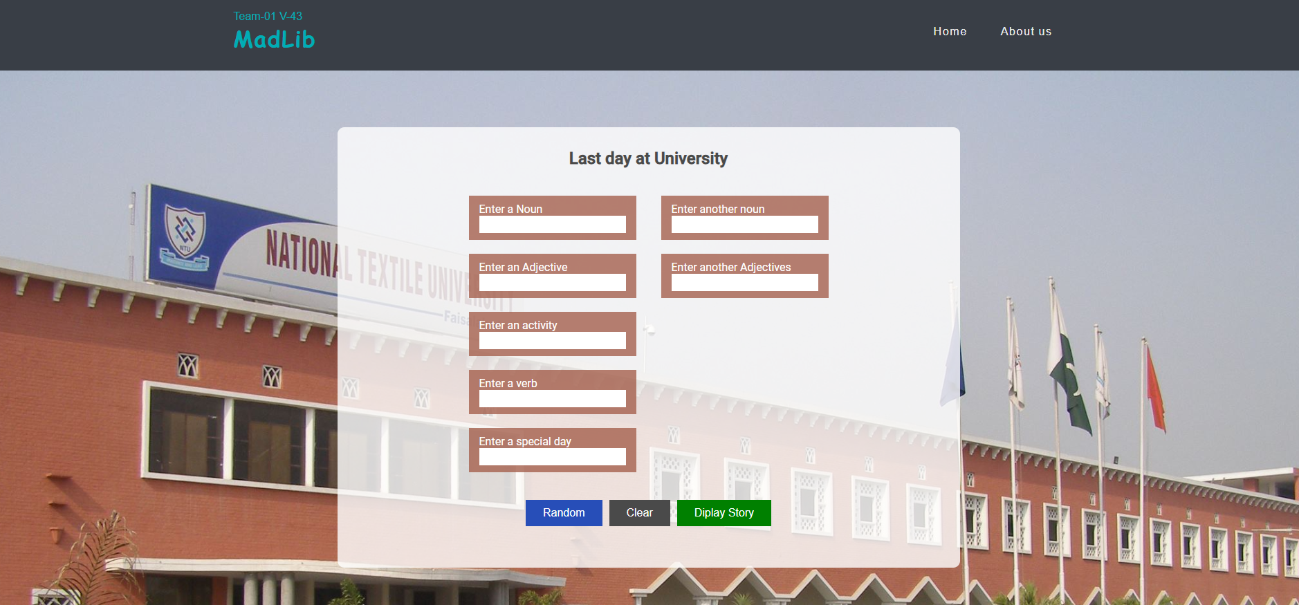 A simple and fun web app created using HTML, CSS, and JavaScript that offers unique stories. Each story comes with a form where users can input words, which are then dynamically inserted into the story to create a customized and humorous narrative. The website features a home page, individual pages for each story, and an "About Us" page.
